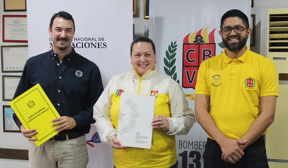 La Dirección Nacional de Migraciones (DNM) y el Cuerpo de Bomberos Voluntarios del Paraguay (CBVP) firmaron hoy el Convenio Marco de Cooperación Interinstitucional y el Acuerdo Específico N° 1, con el objetivo de establecer un trabajo conjunto que fortalezca las capacidades de ambas instituciones y contribuya a la seguridad y bienestar de funcionarios y usuarios.