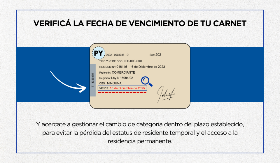 Se insta a las personas con residencia temporal a verificar la fecha de vencimiento de su carnet y realizar el trámite dentro del plazo establecido, a fin de evitar la pérdida del estatus de residente temporal y asegurar el acceso a la residencia permanente.