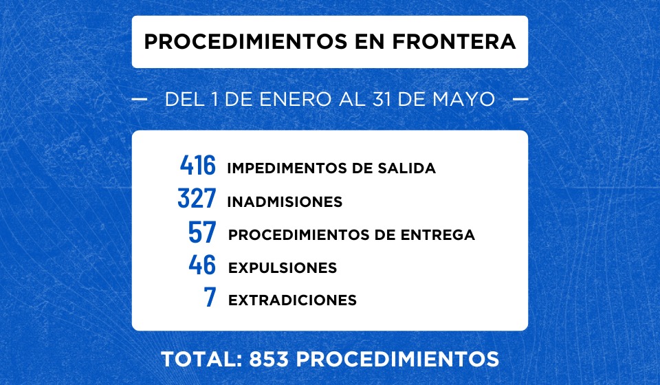 La Dirección Nacional de Migraciones llevó a cabo un total de 853 procedimientos de control migratorio en pasos fronterizos y aeropuertos del país durante los primeros cinco meses del año 2025, en conformidad con lo establecido en la Ley N° 6984/22.