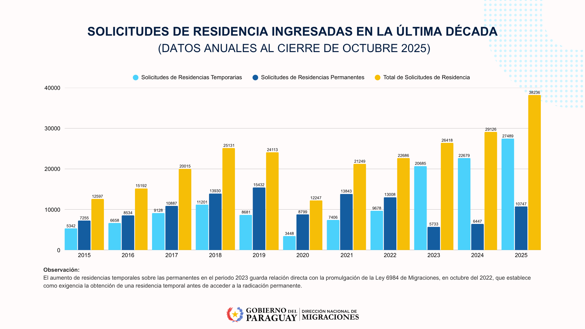 Históricamente, en la última década (2015–2025), el número de solicitudes de residencia ingresadas en Paraguay aumentó en un 203,5%, pasando de 12.597 solicitudes en 2015 a 38.236 en 2025 (a octubre), lo que demuestra un crecimiento sostenido en el interés de ciudadanos extranjeros por radicarse en el país.