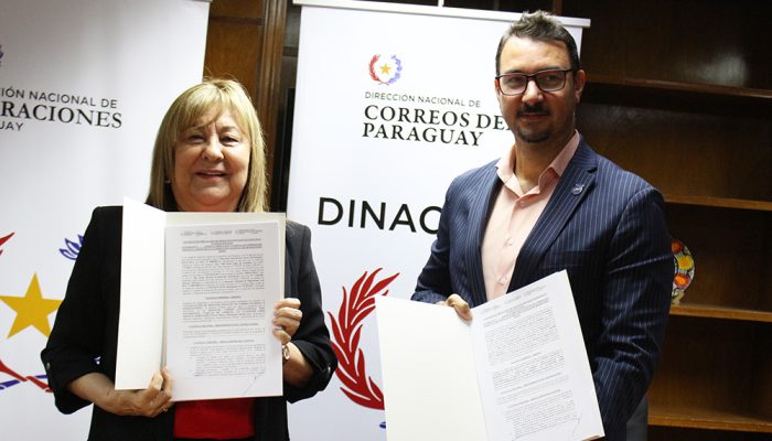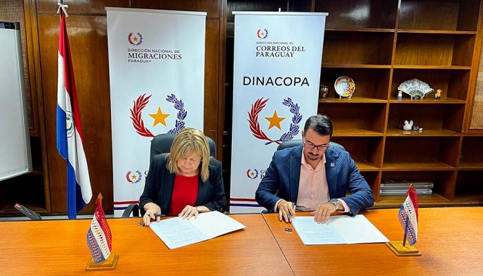 El director nacional de Migraciones, Jorge Kronawetter y la titular de la Dirección Nacional de Correos del Paraguay (DINACOPA), Nidia Rosa López de González, firmaron un contrato de prestación de servicios, estableciendo las bases de colaboración para la contratación de servicios postales nacionales e internacionales.